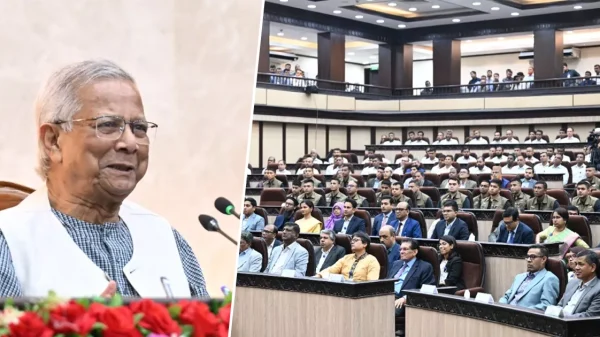 অন্তর্বর্তী সরকারের মেয়াদ শেষ হওয়ার প্রাক্কালে নিজ কার্যালয়ের কর্মকর্তা-কর্মচারীদের উদ্দেশে বিদায়ী ভাষণ দিয়েছেন প্রধান উপদেষ্টা অধ্যাপক মুহাম্মদ ইউনূস। সোমবার (১৬ ফেব্রুয়ারি) ভাষণ শেষে তিনি কার্যালয়ে উপস্থিত কর্মকর্তা ও কর্মচারীদের সঙ্গে ফটোসেশনে অংশ নেন। অধ্যাপক ইউনূসের নেতৃত্বে ২০২৪ সালের ৮ আগস্ট
