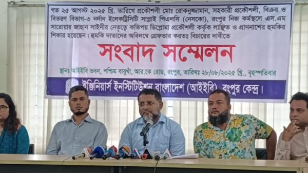 প্রকৌশলীকে জবাইয়ের হুমকি প্রতিবাদে রংপুরে আইইবির মানববন্ধন ও সংবাদ সম্মেলন