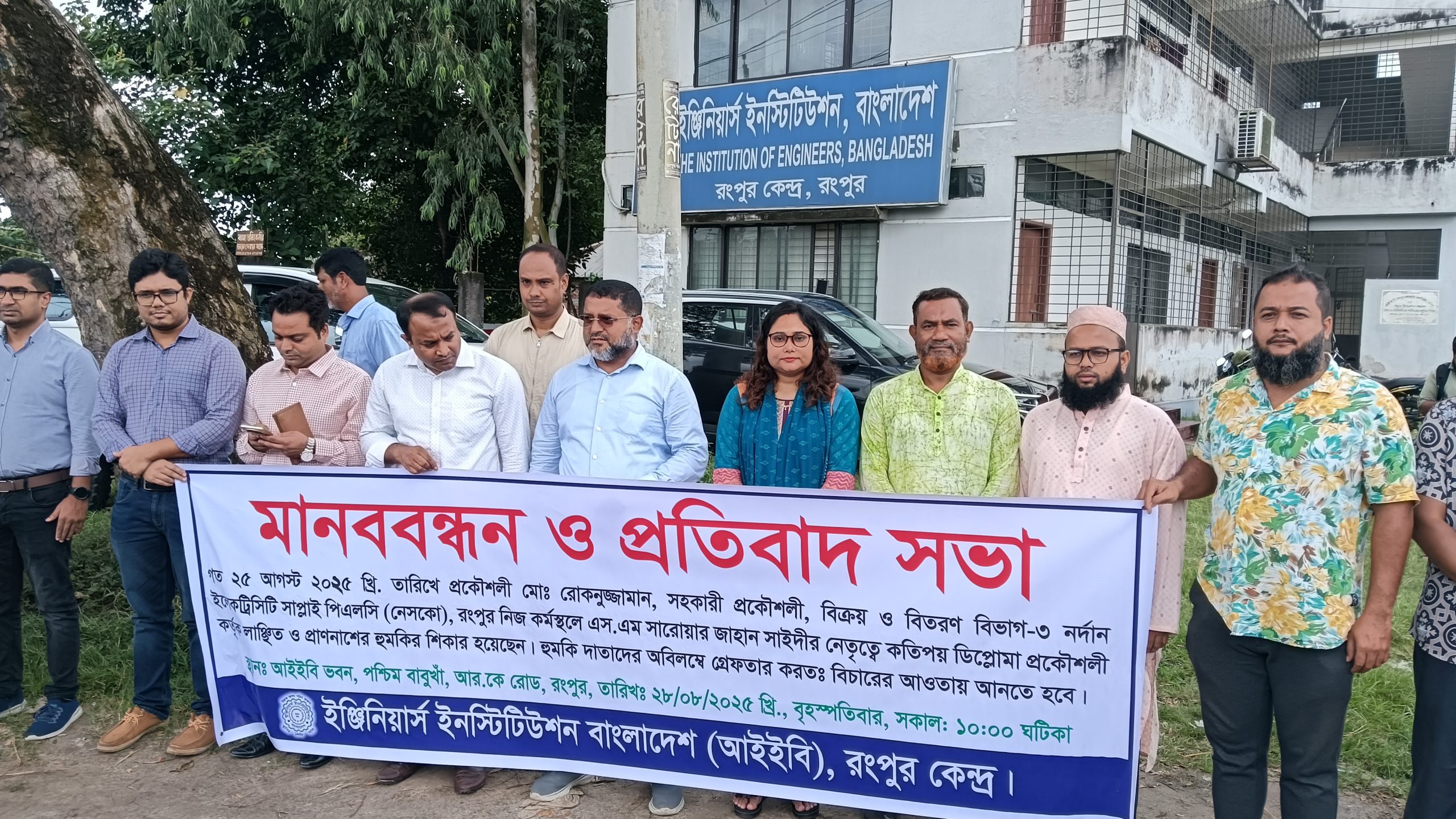 রংপুরে নেসকোতে কর্মরত সহকারী প্রকৌশলী রোকনুজ্জামানকে জবাই করে হত্যার হুমকির ঘটনায় চরম ক্ষোভ ও প্রতিবাদ জানিয়েছেন ইন্সটিটিউশন অব ইঞ্জিনিয়ার্স, বাংলাদেশ (আইইবি) রংপুর কেন্দ্র। উক্ত ঘটনার প্রতিবাদে বৃহস্পতিবার (২৮ আগস্ট) সকালে ইন্সটিটিউশন অব ইঞ্জিনিয়ার্স, বাংলাদেশ (আইইবি) রংপুর কেন্দ্রের আয়োজনে নগরীর আরকে রোডস্থ ইঞ্জিনিয়ার্স ইনস্টিটিউশন ভবনের সামনে নির্বাহী প্রকৌশলী রবিউল ইসলামের সভাপতিত্বে মানববন্ধন ও প্রতিবাদ সমাবেশ কর্মসূচি পালন করা হয় পরে অফিস হলরুমে সংবাদ সম্মেলন অনুষ্ঠিত হয়। সংবাদ সম্মেলনে লিখিত বক্তব্য পাঠ করেন আইইবি রংপুর কেন্দ্রের সাধারণ সম্পাদক প্রকৌশলী সাকিউল আলম।