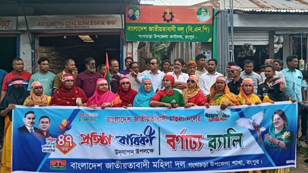 বাংলাদেশ জাতীয়তাবাদী মহিলা দলের ৪৭ তম প্রতিষ্ঠা বার্ষিকীতে গংগাচড়া উপজেলা মহিলা দলের আয়োজনে বর্ণাঢ্য র্যালী অনুষ্ঠিত হয়েছে। মঙ্গলবার বিকাল ৪ ঘটিকায় গংগাচড়া উপজেলা বিএনপির অফিস থেকে বর্ণাঢ্য র্যালী বের হয়। ...বিস্তারিত পড়ুন